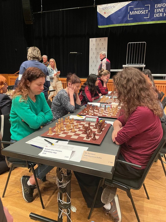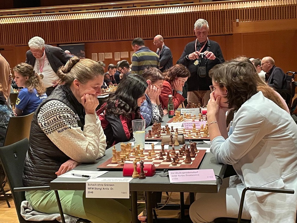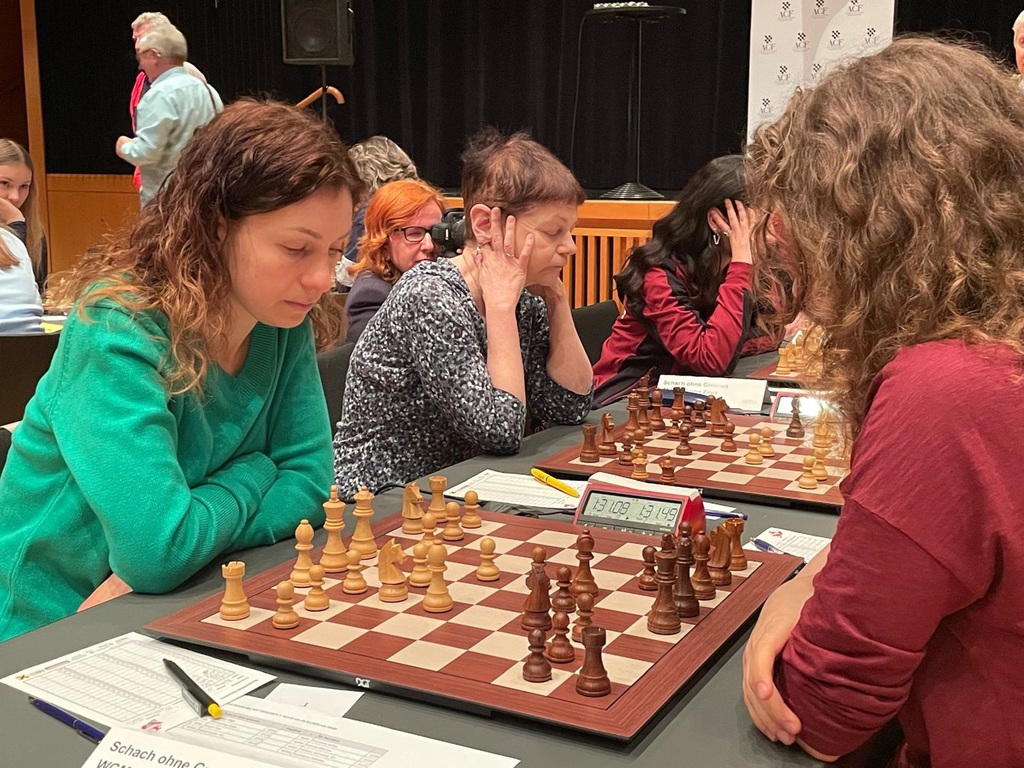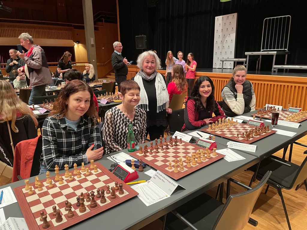 Aber weder Marina (Brett 1) noch Marharyta (Brett 4) sorgten für den ersten Zähler, sondern Olga, die nach 3 Stunden eine offene Turmlinie sehr sicher zum Erfolg ummünzte. Aber es dauerte nicht lange und Marina hatte in einer taktischen Stellung den besseren Durchblick und sorgte für das 2:0. Marharyta verwertete zwei Mehrbauern zum 3:0. Da wollte Tea natürlich nicht zurückstecken. In einer taktischen Stellung gewann sie locker Material und nach 3,5 Stunden durften wir ein 4:0 unterschreiben.